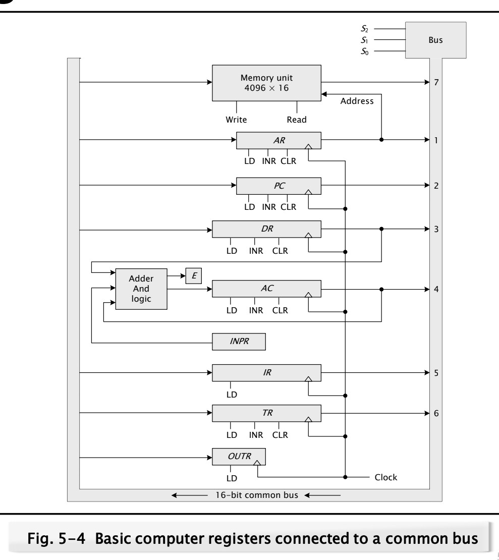 기본 컴퓨터(Basic Computer)의 경우 기본적으로 6개의 레지스터와 메모리유닛(memory unit), 컨트롤 유닛(control unit)을 가진다. 레지스터와 다른 레지스터, 메모리와 레지스터 사이의 정보를 전달하기 위해서는 통로가 필요하다. 추가적으로 각각의 레지스터 입력과 출력 사이에서의 연결 선이 지나치게 많을 것인데 이것을 효과적으로 설계해주는 것이 common bus system이다.