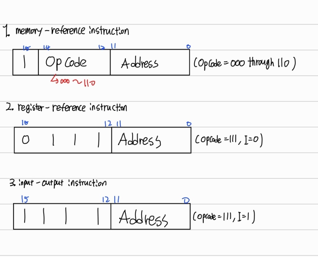 12비트(0~11)까지는 주소(Address)를 가지고 3비트(12~14)까지는 Opcode(Operation Code)를 가진다. 마지막으로 1비트(15)에는 addressing Mode 즉 직접주소(0)인지 간접주소(1)인지를 나타낸다.