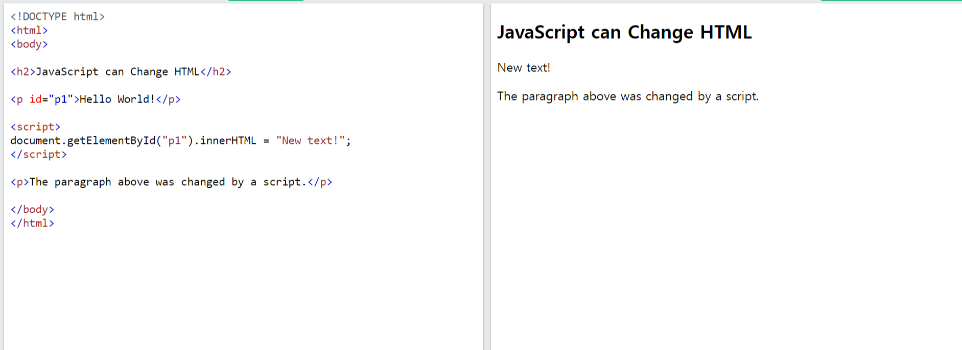 이것은 <script> 부분에서 document.getElementByID("p1").innerHTML = "New text!"를 통해 바꾸었기 때문이다.
