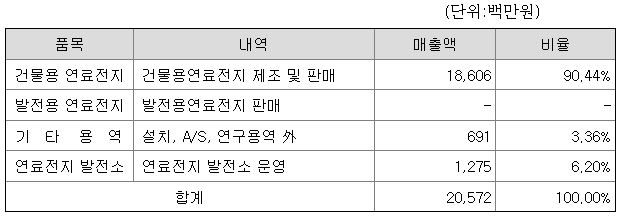 위 자료 보시다시피, 건물용 연료전지 제조 및 판매가 전체 매출의 90%를 차지하며, 회사의 주된 수익원으로 자리 잡고 있습니다. 기타 용역과 연료전지 발전소 운영이 나머지 10%를 구성하고 있으며, 발전용 연료전지는 현재 매출에 포함되지 않았습니다.