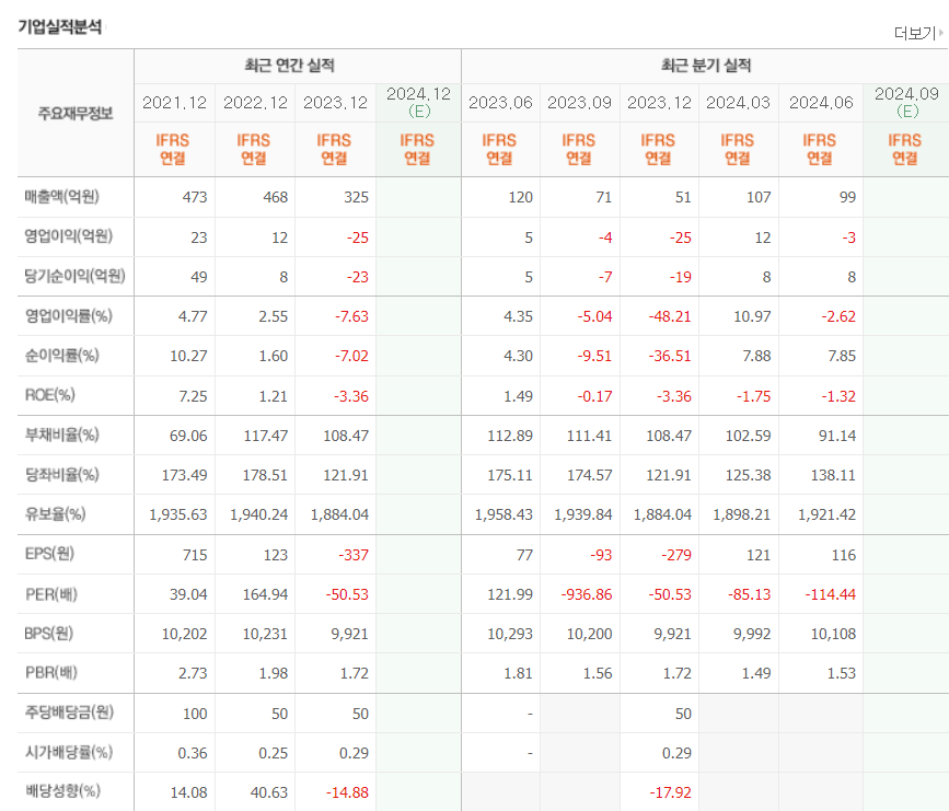 최근 연간 실적을 보게 되면 2023년부터 영업이익, 당기순이익이 적자전환된 것을 볼 수 있습니다. 투자하는 입장에서는 만약 적자가 지속이 된다면 아무리 성장주여도 기업 성장 가능성에 크게 부정적인 영향을 미칠 수 있어 주의가 필요합니다.. 추가적으로 최근 분기 실적을 보면 계속해서 ROE(자기자본 이익률)이 4분기 연속 적자를 나타냄으로써 주주의 자본을 이용해 수익을 창출하는 능력이 떨어지고 있다는 것을 볼 수 있습니다. PER(주당수익비율)의 경우 4분기 연속 마이너스를 나타냄으로써 기업의 순손실이 4분기 연속 지속되고 있다는 것을 볼 수 있습니다.