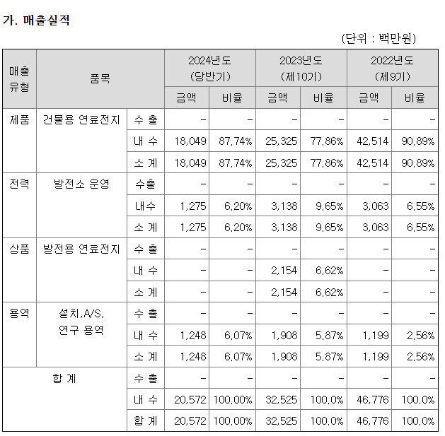 2024년 6월 반기보고서에 따르면, 에스퓨얼셀의 품목별 매출 구성은 위와 같습니다.