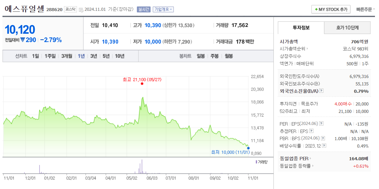 2024년 11월 1일 기준으로 에스퓨얼셀 주가는 10,120원입니다.