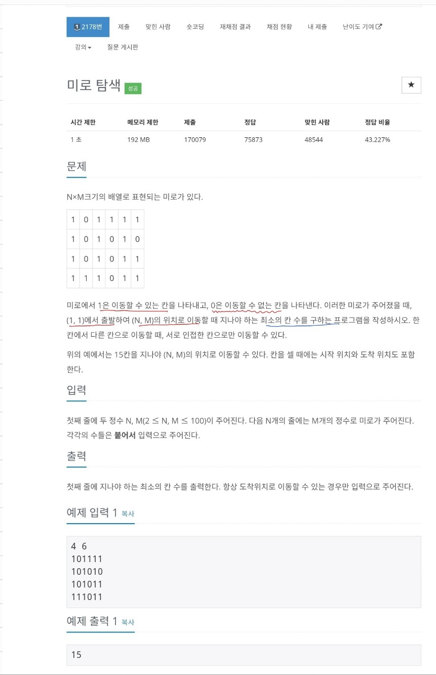 -> 문제를 해결하는데 있어서 중요한 부분은 미로에서 1일 때만 이동이 가능하고 (1,1)에서 출발해 (N,M)까지 이동할 때 지나야하는 최소의 칸 수를 구해야한다. 여기서 입력을 배열형태로 입력을 받을 경우 (0,0)에서 (N-1,M-1)까지로 받아야한다.